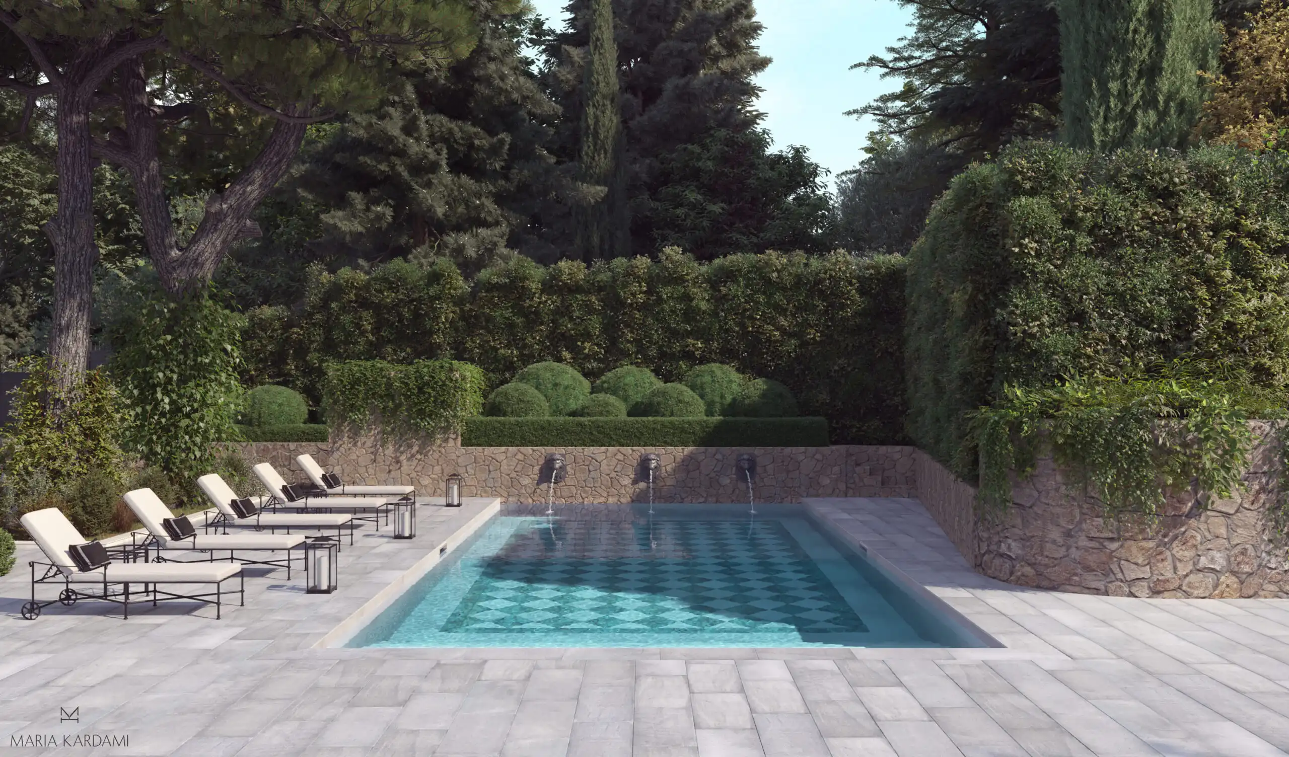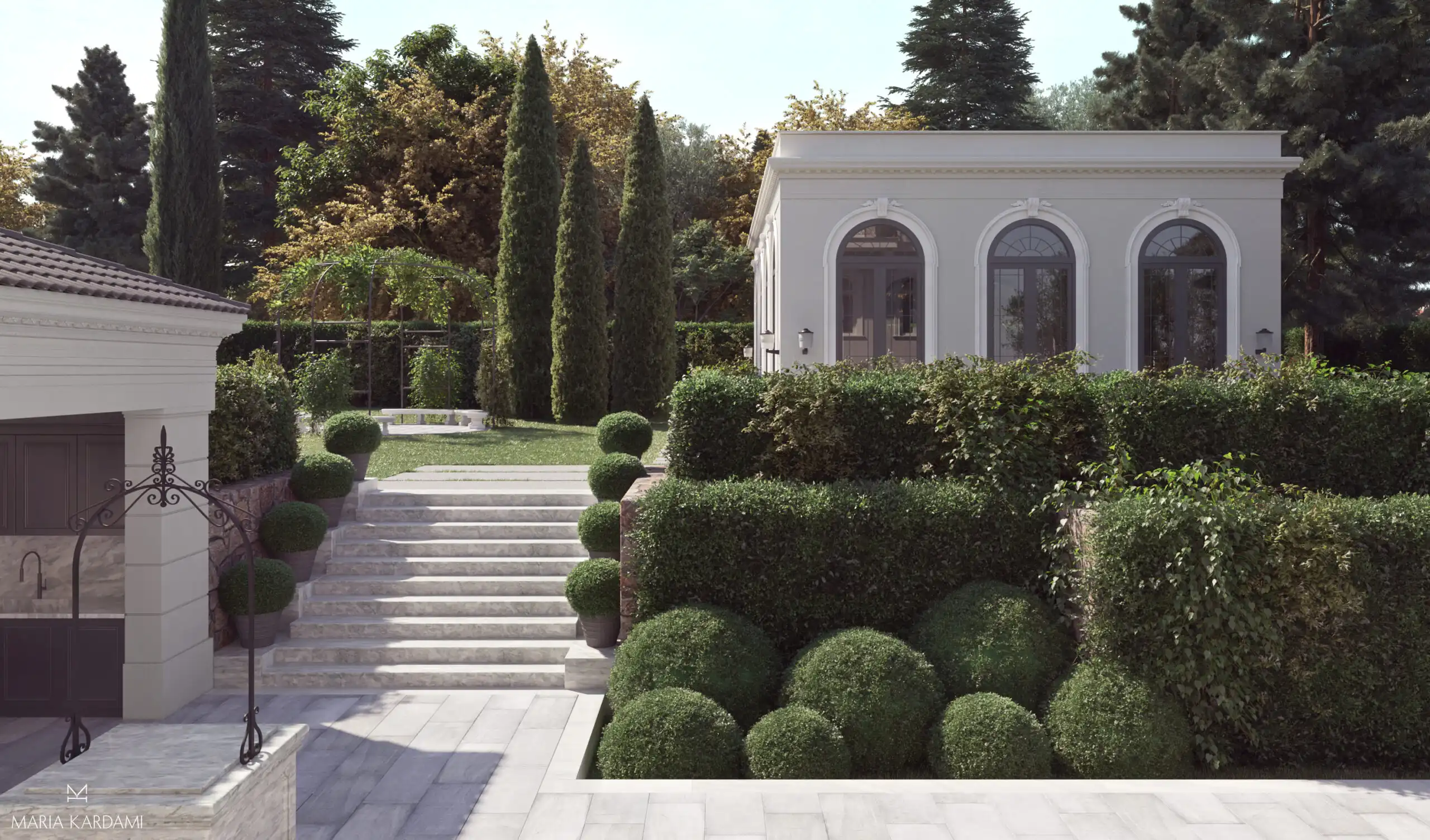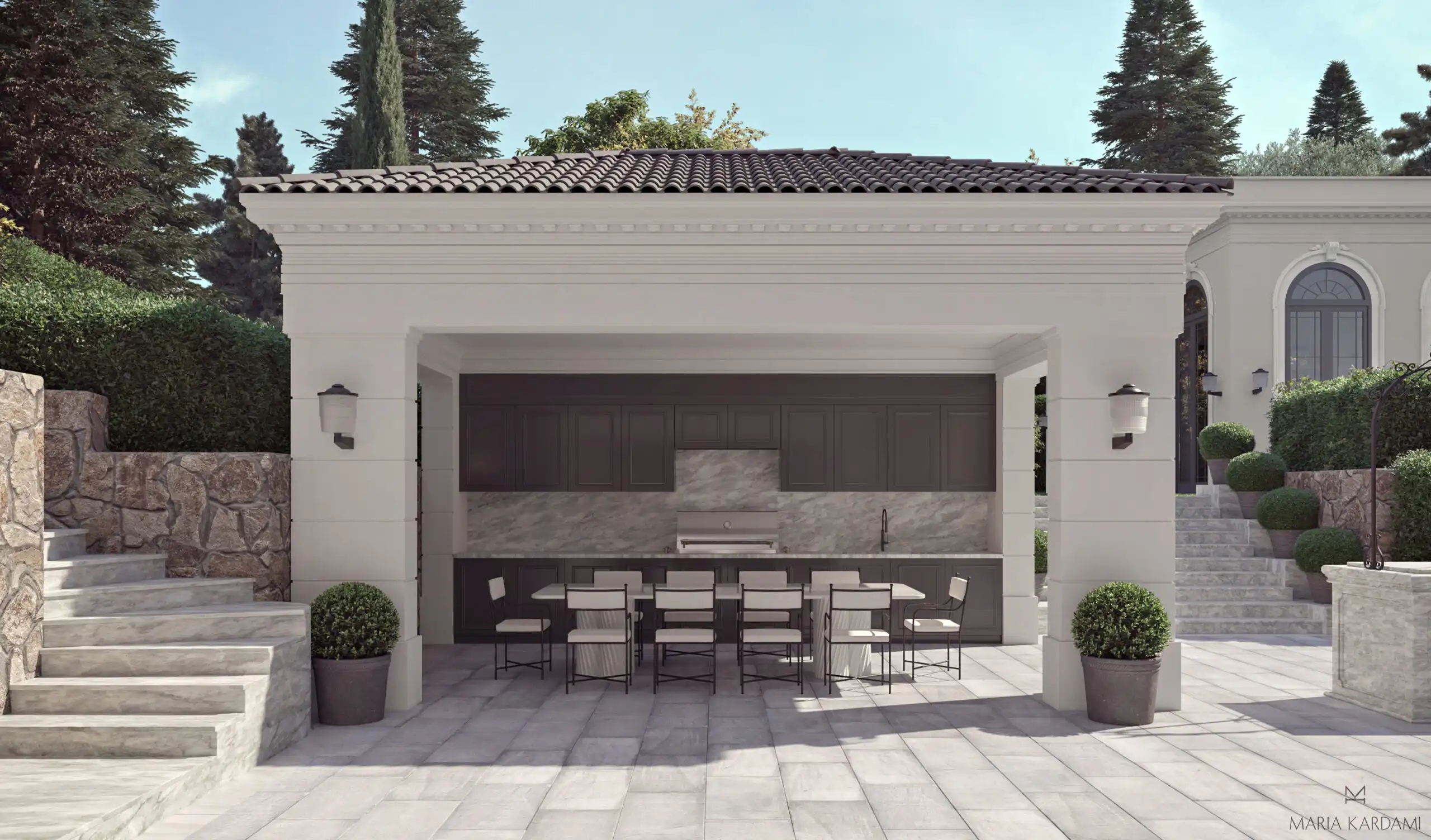 Εξωτερικά, η νεοκλασική ομορφιά του AD Project εκτείνεται πέρα από το ίδιο το σπίτι, με προσεκτικά σχεδιασμένους εξωτερικούς χώρους που ανταγωνίζονται το μεγαλείο του εσωτερικού. Φωλιασμένη μέσα στον μαγευτικό κήπο, περιμένει μια αστραφτερή πισίνα, προσκαλώντας τους κατοίκους να απολαύσουν δροσιστικές βουτιές ενώ απολαμβάνουν τον μεσογειακό ήλιο. Δίπλα στην πισίνα, ένα περίπτερο αποτελεί ένα γαλήνιο καταφύγιο, προσφέροντας ανάπαυλα από τη ζέστη της ημέρας και ένα γραφικό σκηνικό για χαλάρωση και περισυλλογή.