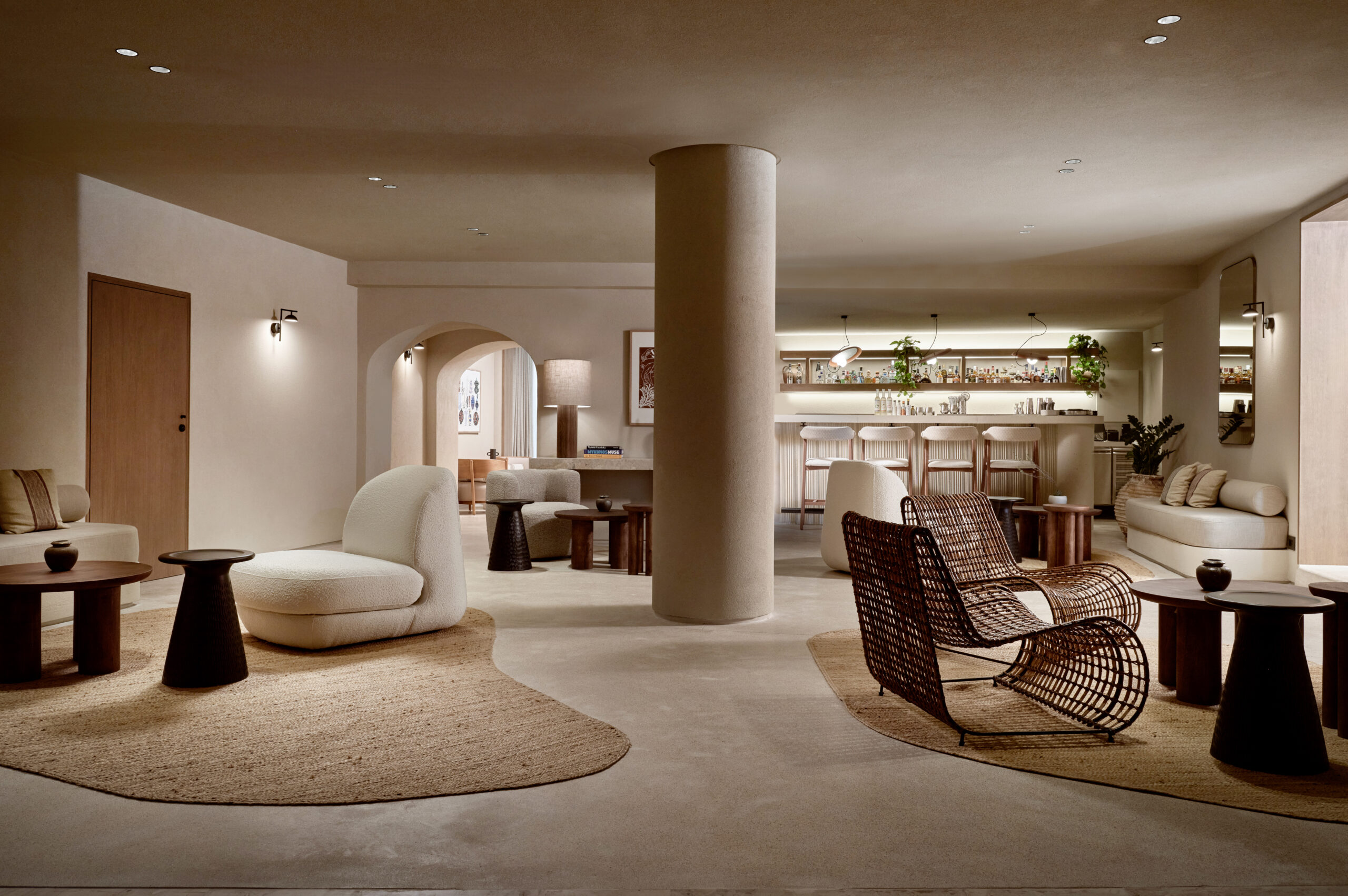 Το κτίριο ενσωματώνει μια επιλογή από φυσικά υλικά όπως μάρμαρο, ξύλο και τοπική πέτρα στην κατασκευή και τη διακόσμησή του. Αυτά τα στοιχεία όχι μόνο συμβάλλουν στην κυκλαδική αισθητική, αλλά και προκαλούν μια αίσθηση γείωσης και σύνδεσης με την φυσική ομορφιά του νησιού. Εκπληκτικά πανοράματα του Αιγαίου είναι χαρακτηριστικό γνώρισμα αυτού του σχεδιασμού.
