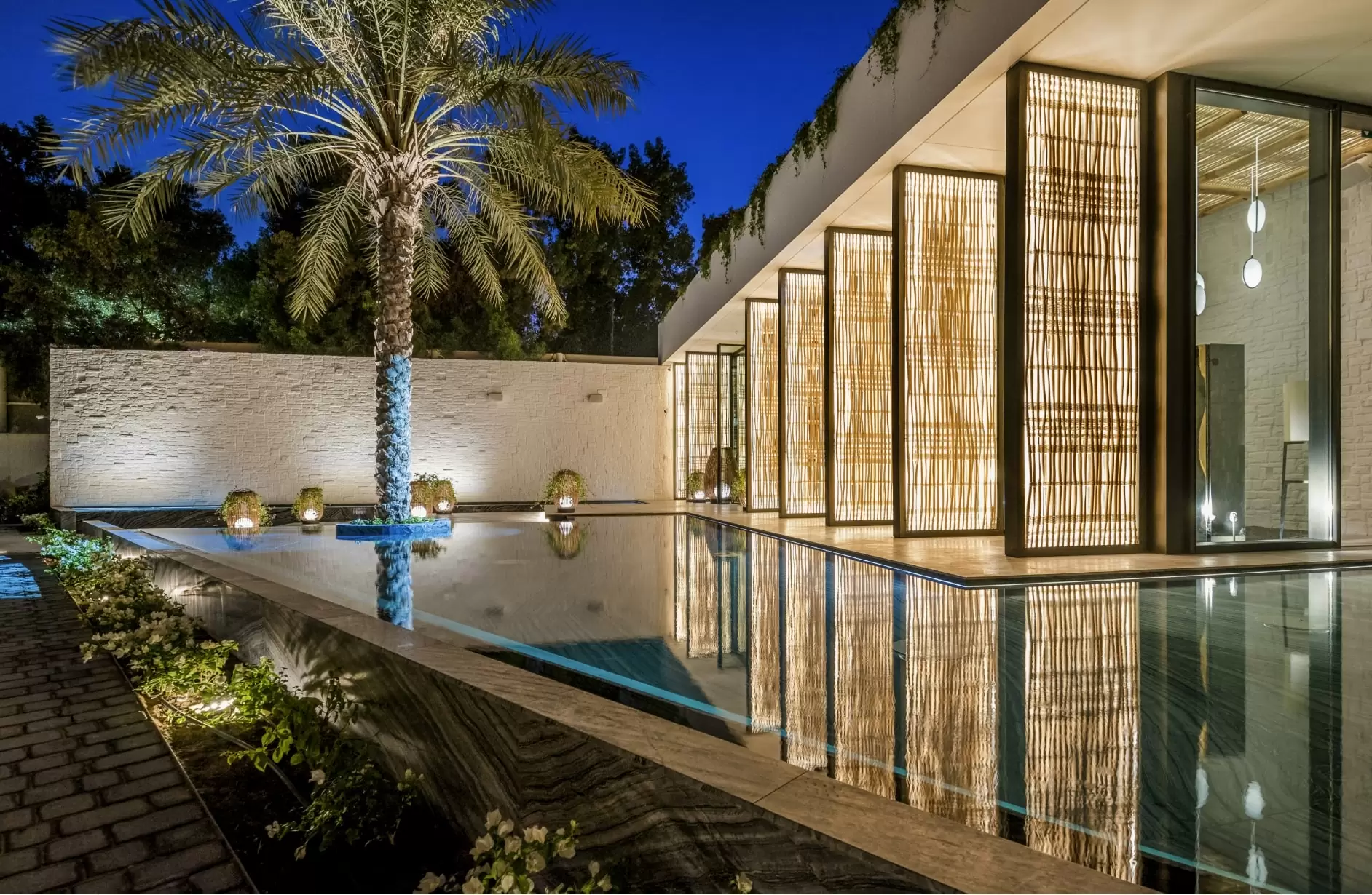 Μεγάλες κλιμακωτές πισίνες αντανάκλασης περιβάλλουν την πρόσοψη του κτιρίου, αντανακλώντας τον ουρανό του Ντουμπάι και δίνοντας την ψευδαίσθηση μιας αιωρούμενης γυάλινης κατασκευής. Το ταξίδι ξεκινά με την εμβληματική μυκονιάτικη ζωγραφισμένη χωματόπετρα ως το κύριο σκηνικό του εσωτερικού λόμπι αφίξεων. Οι ατμοσφαιρικές κόγχες με κεριά δημιουργούν ένα ζεστό φράγμα μεταξύ της άφιξης και του ενθουσιασμού που βρίσκεται πέρα από αυτήν.