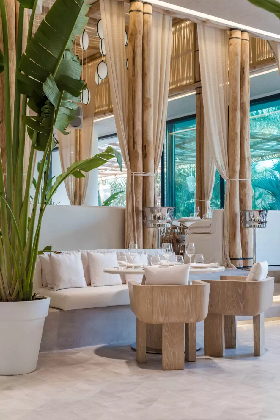 Η χρήση ελαφρών, φυσικών φινιρισμάτων και ουδέτερης παλέτας επιτρέπει στη μαγευτική θέα της παραλίας και του καταπράσινου εξωτερικού κήπου να βρεθούν στο επίκεντρο. Ένα ισορροπημένο μείγμα πολυτελούς και χαλαρής επίπλωσης μεταδίδει ποιότητα και άνεση. Ο σχεδιασμός των εσωτερικών επίπλων επιτρέπει ατελείωτες ρυθμίσεις που μπορούν εύκολα να επανατοποθετηθούν σε μια στιγμή. Αυτός ο μεθοδικός σχεδιασμός εφαρμόζεται σε όλους τους χώρους, εξασφαλίζοντας την απρόσκοπτη σύνδεση και την ευελιξία του προγράμματος σε όλους τους εσωτερικούς χώρους.