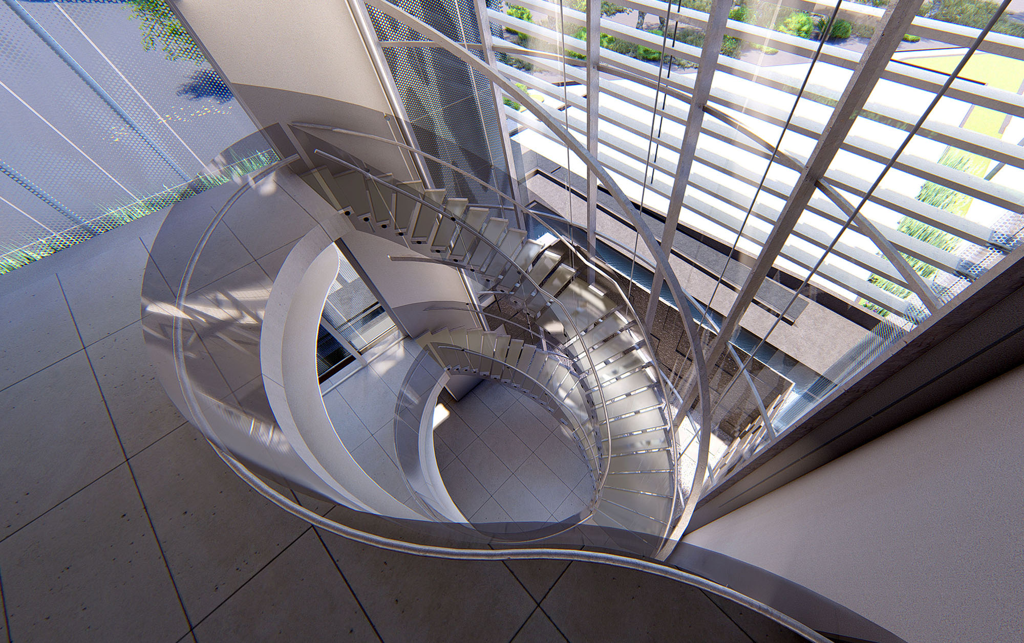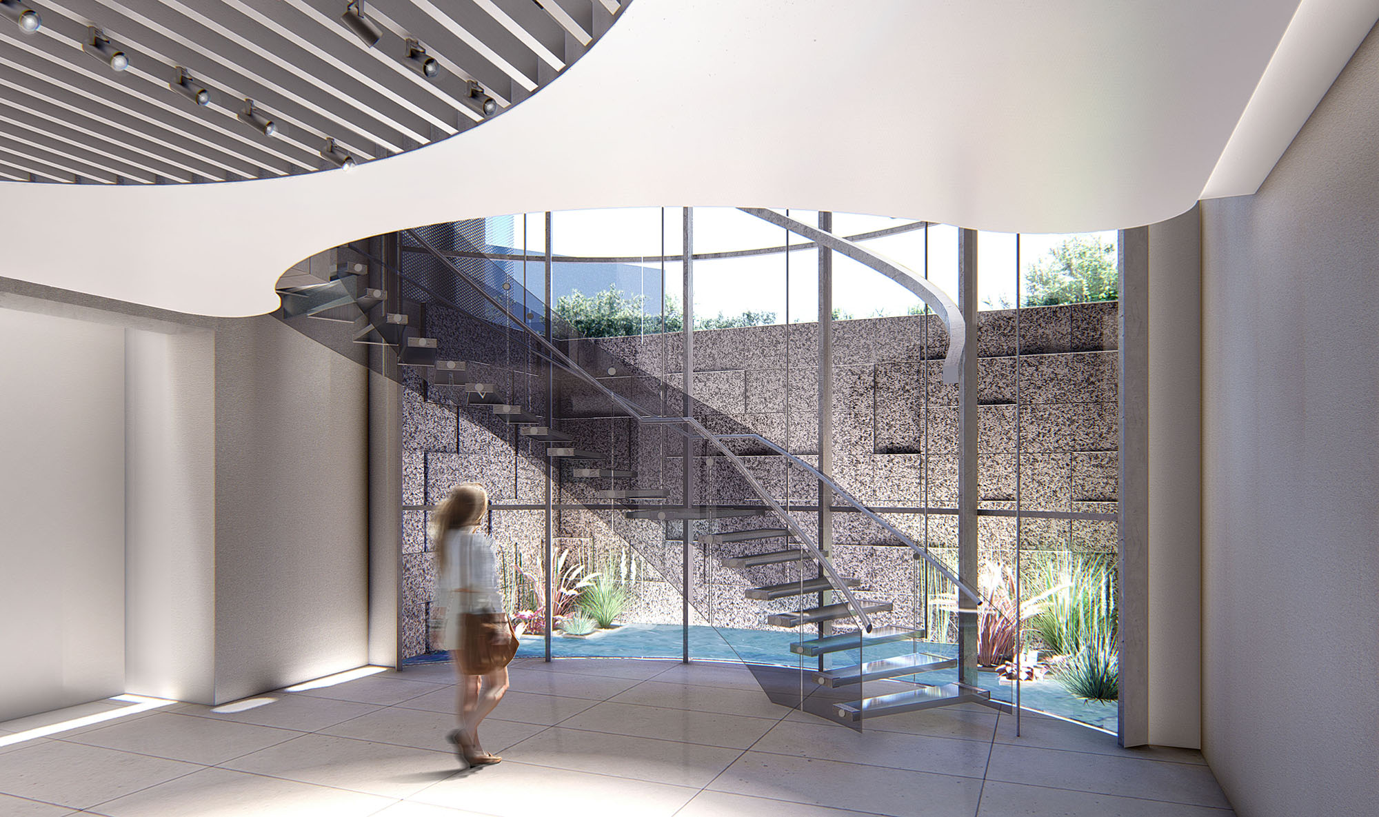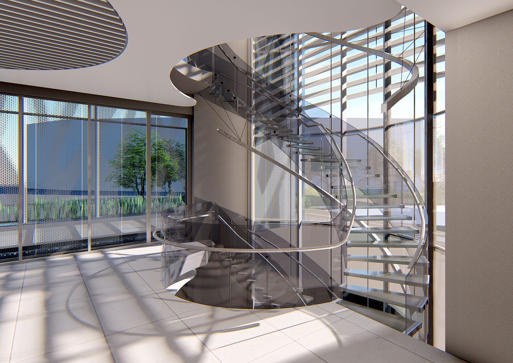 Η είσοδος του κτιρίου σημειώνεται από μια ελαφριά γυάλινη σκίαση, υποστηριζόμενη από ψηλές και λεπτές ατσάλινες κολώνες και ένα γραμμικό γυάλινο δάπεδο, το οποίο κατευθύνει τον επισκέπτη προς το εσωτερικό. Το εσωτερικό διατηρεί τον εκθεσιακό χαρακτήρα, με επενδύσεις τοίχων από γυαλί και την έντονη παρουσία της κύριας γυάλινης σκάλας. Η σκάλα ξεχωρίζει ως το πιο εντυπωσιακό έκθεμα, με την προηγμένη τεχνολογία κατασκευής της. Το γλυπτικό ελλειπτικό σχήμα της δίνει την εντύπωση μιας ξεδιπλωμένης κορδέλας, δημιουργώντας μια συνεχή ροή μεταξύ των επιπέδων των εκθεσιακών χώρων.